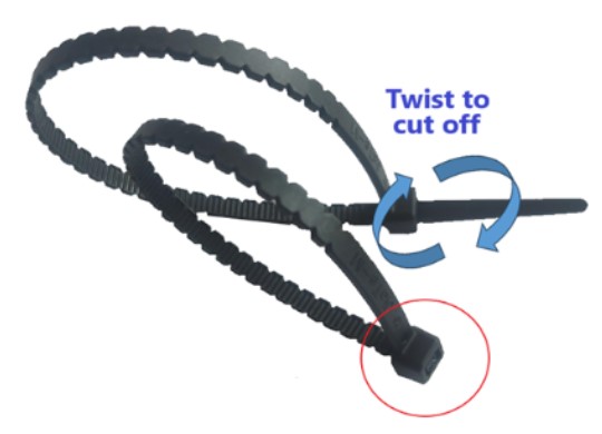 Zwarte kabelbinders zijn beter beschermd tegen UV straling door toevoeging van koolstof. Temperatuurbereik van -10° tot + 80°. Goede weerstand tegen oliën, zuren en vetten. De gekartelde constructie van deze "TWIST OFF" kabelbinder maakt het afkorten van de aangetrokken kabelbinder eenvoudig uit te voeren zonder werktuig, door middel van een draaiende beweging, en laat geen scherpe uiteinden na waardoor een veiligere afwerking wordt bekomen.